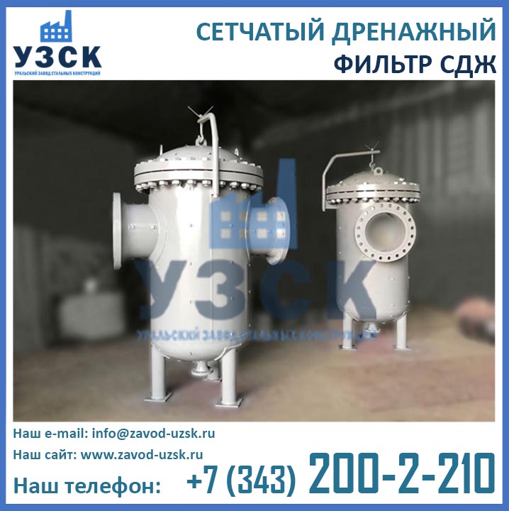 На формирование цены дренажного фильтра влияют следующие факторы: материальное исполнение, конструктивное исполнение, стоимость сырья в момент изготовления, комплектация, необходимость доставки в другой населенный пункт, срочность выполнения работ по изготовлению, прочие предпочтения заказчика. Уральский завод стальных конструкций изготавливает фильтры СДЖ-700 любого типового исполнения, а также нестандартные фильтры СДЖ 700 мм по чертежам заказчика или техническому заданию. Дополнительно к фильтрам СДЖ у нас Вы можете заказать сменные фильтрующие элементы любой тонкости фильтрации, ответные фланцы, прокладки и крепеж. По запросу изготавливаем также фильтры СДЖ-К-700 с концевым затвором. Для того чтобы узнать какова цена на фильтр СДЖ Ду700 в Томске с необходимыми Вам характеристиками, отправьте запрос в отдел продаж завода УЗСК по координатам, указанным в разделе «Контакты».