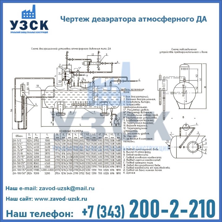 Приобрести качественное оборудование, в том числе, деаэраторы ДА, можно в компании УЗСК в Томске. Мы предлагаем долговечную и надежную продукцию по приемлемой цене. Заказать и купить деаэраторы или другие изделия высокого качества можно через сайт Уральского Завода Стальных Конструкций, или позвонив по указанному в разделе «Контакты» телефону.